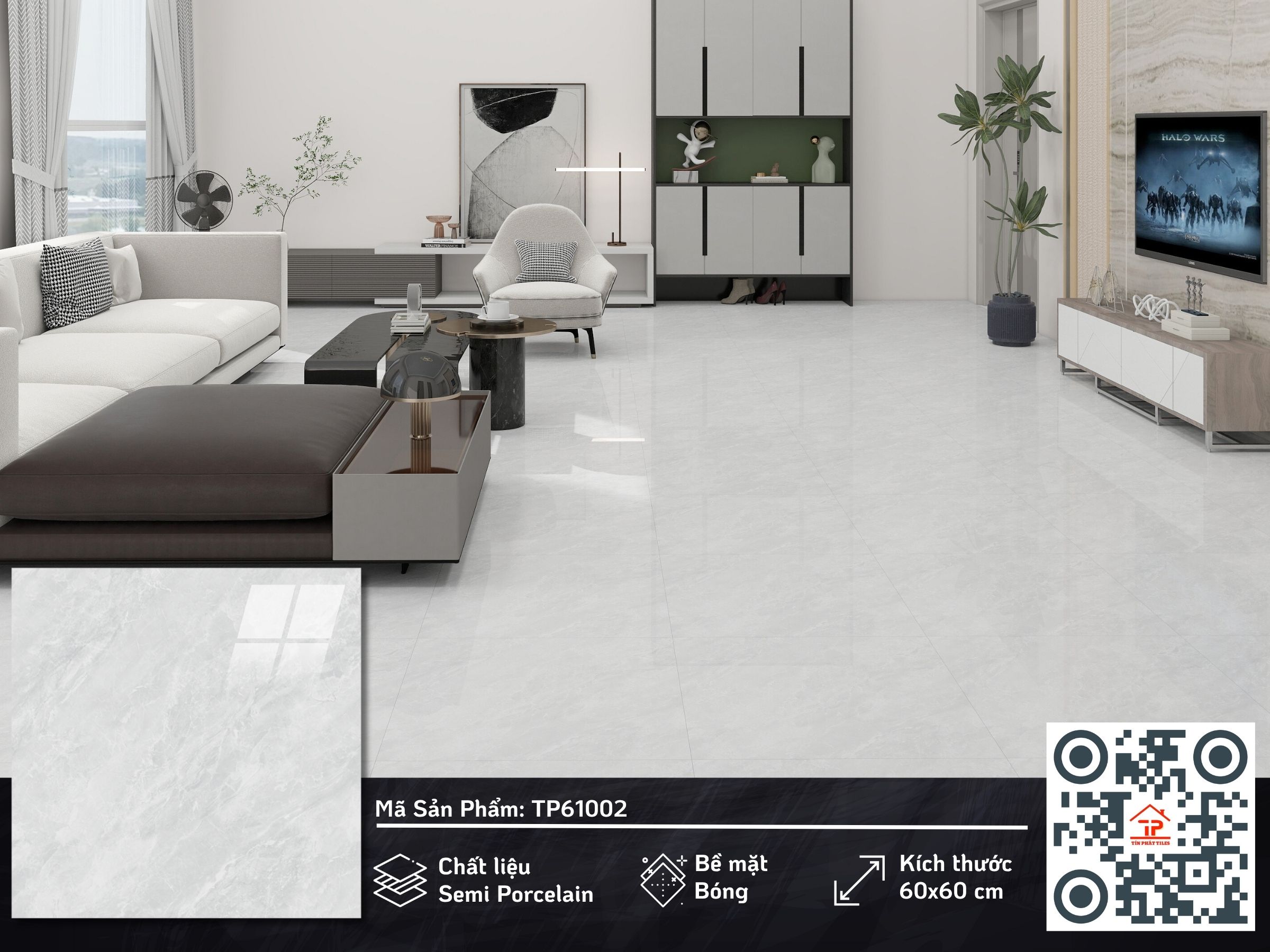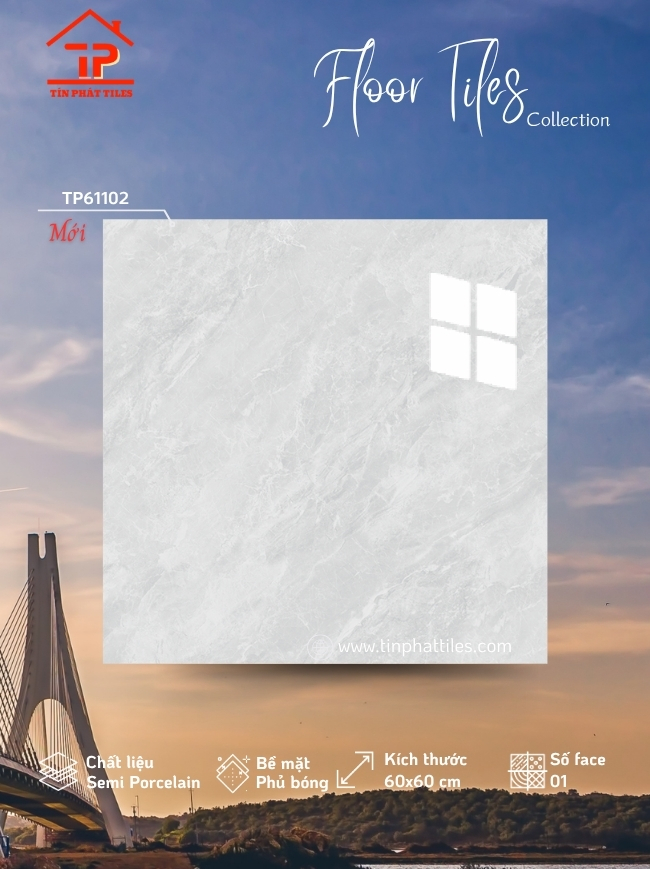 Không cần quá cầu kỳ, gạch 60x60cm xương bán sứ phủ men bóng vẫn đủ sức làm không gian “bừng sáng” theo cách rất riêng. Kích thước vuông vức tạo cảm giác gọn gàng, dễ phối, trong khi lớp men bóng như một tấm gương tinh tế, phản chiếu ánh sáng giúp căn phòng trở nên rộng rãi và sạch sẽ hơn. Bên trong là xương bán sứ chắc chắn, mang lại độ bền ổn định theo thời gian, vừa đẹp mắt vừa thực dụng.