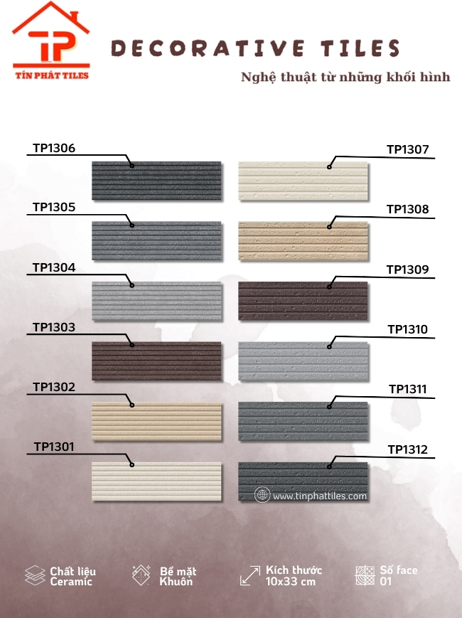 Phá bỏ những quy chuẩn về kích thước truyền thống, dòng gạch trang trí 10x33cm mang đến một làn gió mới, mảnh mai và thanh thoát hơn. Với tỷ lệ "tỉ vàng" thuôn dài, mỗi viên gạch không chỉ là vật liệu xây dựng mà còn là ngôn ngữ nghệ thuật, giúp kéo dài không gian và tạo nên những nhịp điệu kiến trúc độc đáo. Sự kết hợp giữa chất liệu ceramic cao cấp và bề mặt men tinh xảo hứa hẹn sẽ là điểm nhấn khó rời mắt cho mọi công trình.