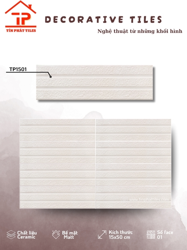 Mang trong mình tỷ lệ cân đối và dáng gạch thanh thoát, bộ sưu tập 15x50cm mở ra một “ngôn ngữ thiết kế” rất riêng cho không gian sống. Không quá nhỏ như gạch trang trí truyền thống, cũng không quá lớn để gây áp lực thị giác, kích thước này tạo nên sự hài hòa vừa vặn, giúp bức tường trở nên gọn gàng mà vẫn đầy điểm nhấn. Kết hợp cùng chất liệu ceramic bền chắc và bề mặt khuôn/matt tinh tế, từng viên gạch như góp phần dệt nên một tổng thể nhẹ nhàng, sang trọng và có chiều sâu.