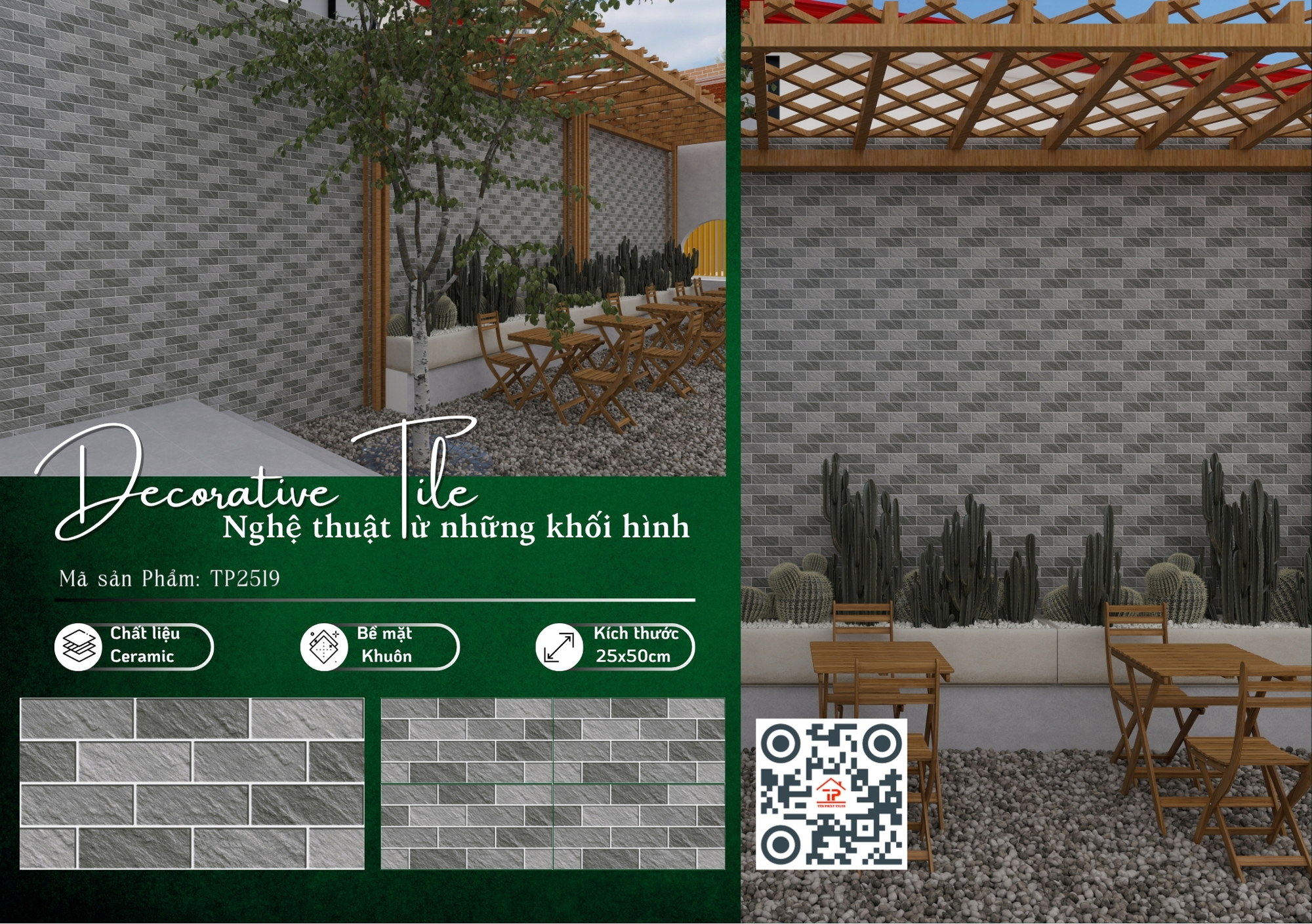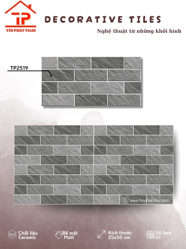 Bộ sưu tập sở hữu kích thước 25x50cm cân đối, dễ thi công, được sản xuất từ chất liệu ceramic bền chắc, phù hợp cho nhiều khu vực ốp tường. Điểm nhấn nằm ở bề mặt khuôn/matt tinh tế, tạo chiều sâu nhẹ nhàng, mang lại cảm giác sang trọng mà vẫn gần gũi, dễ ứng dụng cho phòng khách, phòng tắm hay không gian bếp.