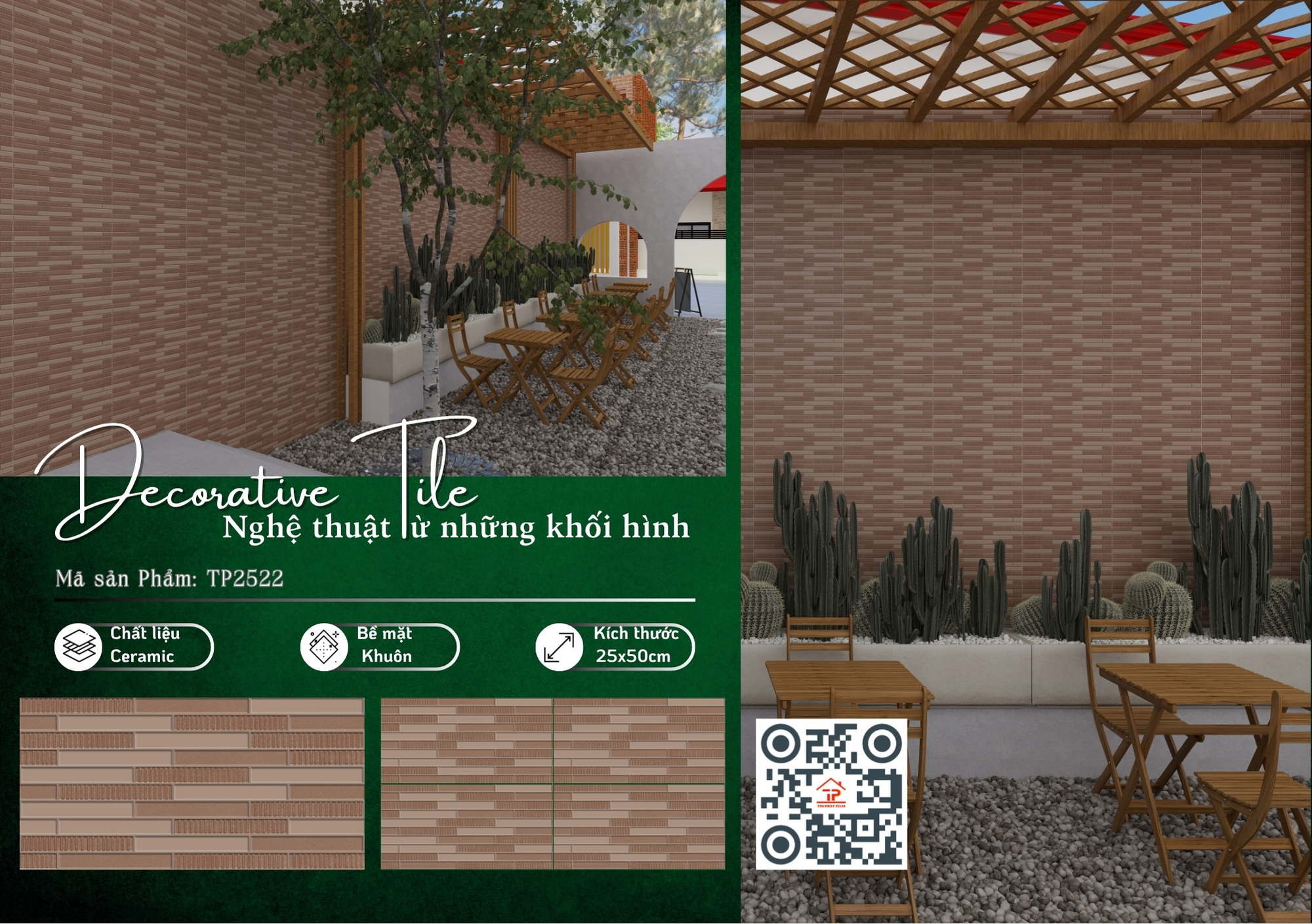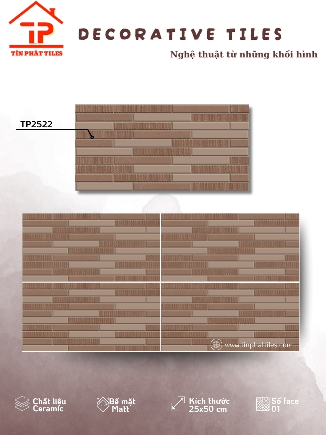 Bộ sưu tập sở hữu kích thước 25x50cm cân đối, dễ thi công, được sản xuất từ chất liệu ceramic bền chắc, phù hợp cho nhiều khu vực ốp tường. Điểm nhấn nằm ở bề mặt khuôn/matt tinh tế, tạo chiều sâu nhẹ nhàng, mang lại cảm giác sang trọng mà vẫn gần gũi, dễ ứng dụng cho phòng khách, phòng tắm hay không gian bếp.