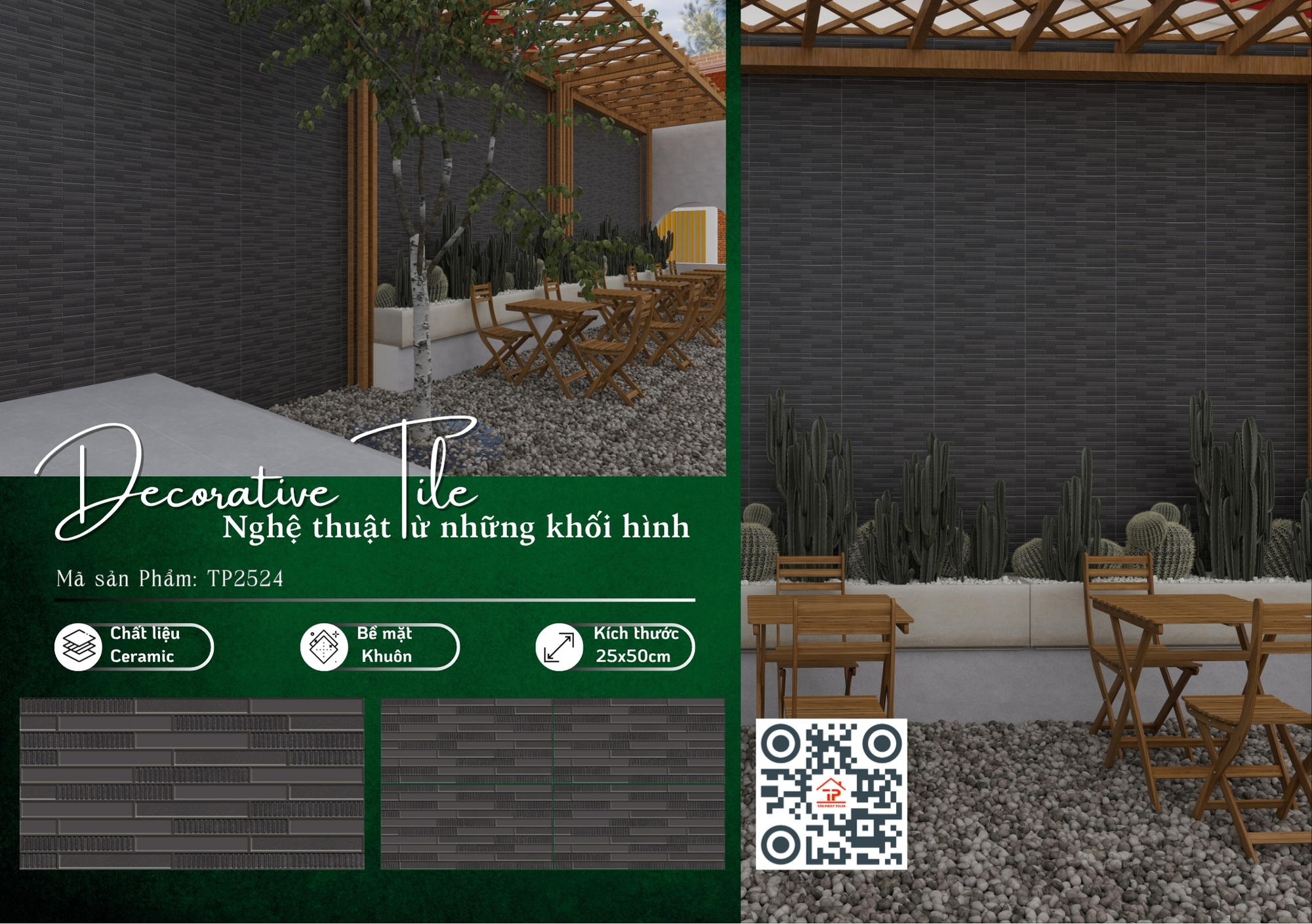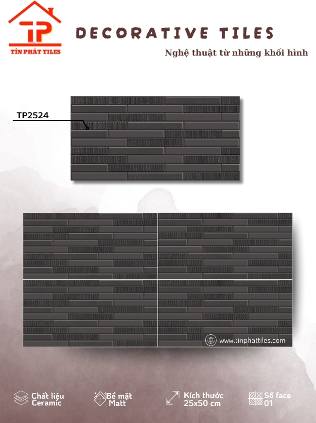 Bộ sưu tập sở hữu kích thước 25x50cm cân đối, dễ thi công, được sản xuất từ chất liệu ceramic bền chắc, phù hợp cho nhiều khu vực ốp tường. Điểm nhấn nằm ở bề mặt khuôn/matt tinh tế, tạo chiều sâu nhẹ nhàng, mang lại cảm giác sang trọng mà vẫn gần gũi, dễ ứng dụng cho phòng khách, phòng tắm hay không gian bếp.