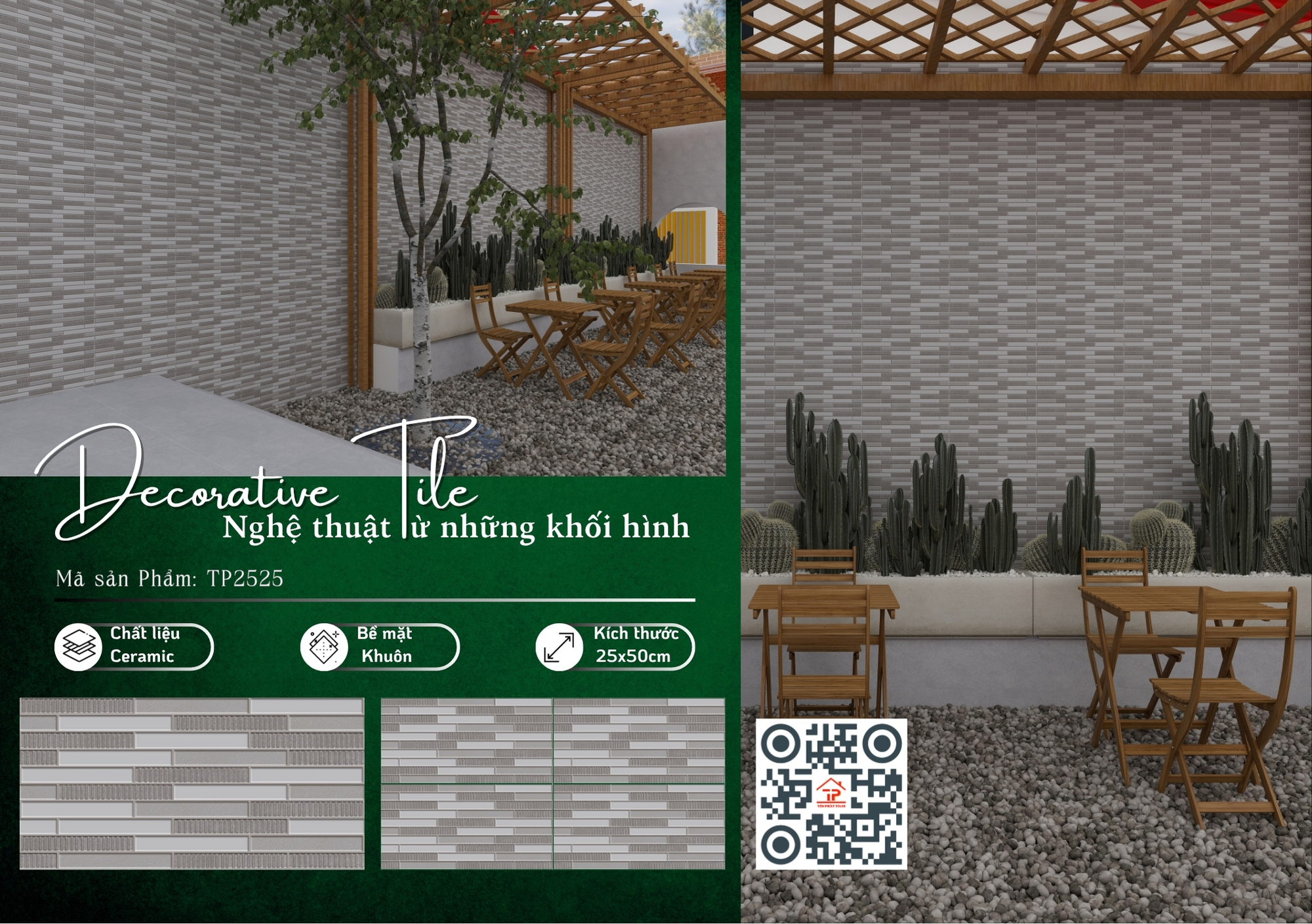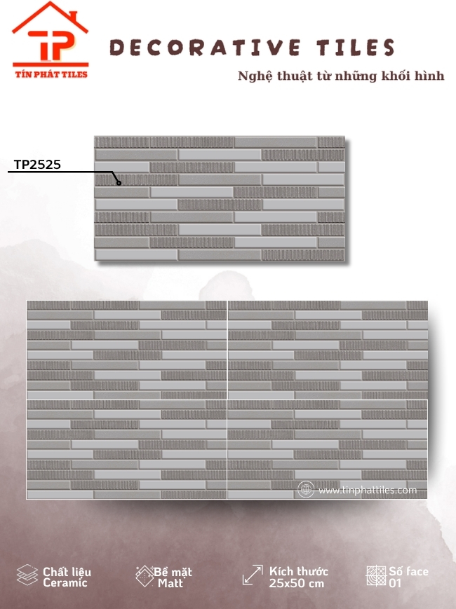 Bộ sưu tập sở hữu kích thước 25x50cm cân đối, dễ thi công, được sản xuất từ chất liệu ceramic bền chắc, phù hợp cho nhiều khu vực ốp tường. Điểm nhấn nằm ở bề mặt khuôn/matt tinh tế, tạo chiều sâu nhẹ nhàng, mang lại cảm giác sang trọng mà vẫn gần gũi, dễ ứng dụng cho phòng khách, phòng tắm hay không gian bếp.