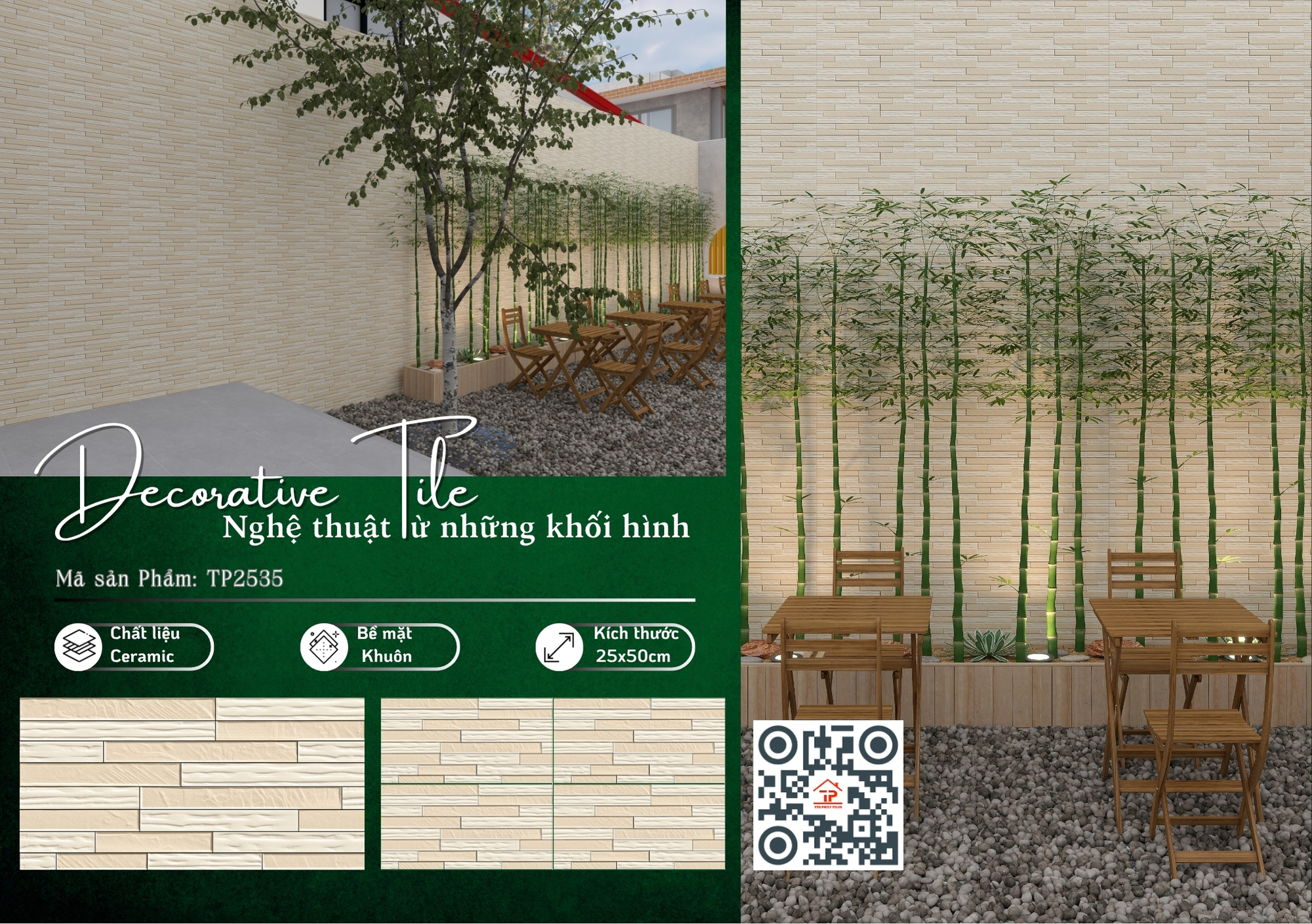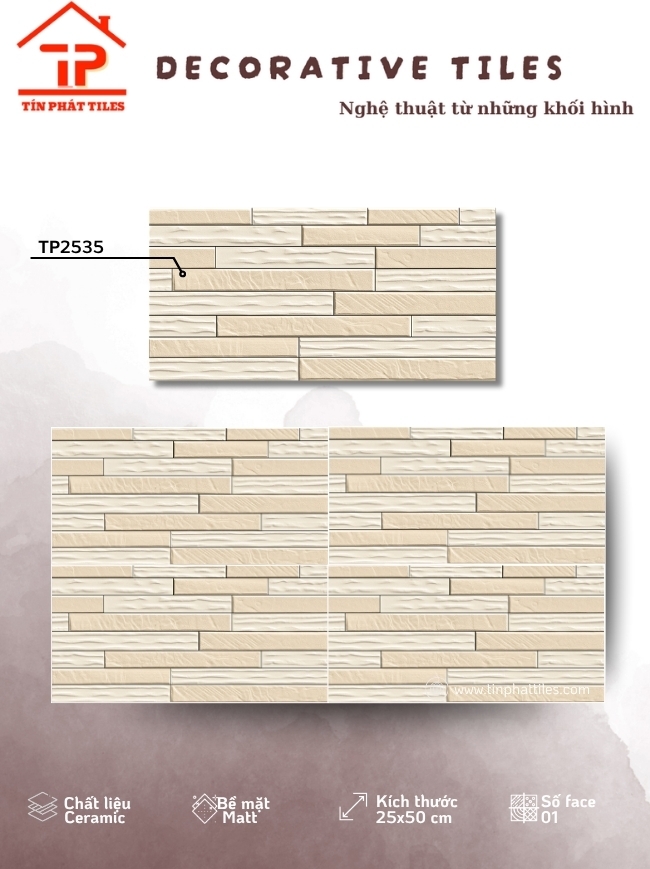 Bộ sưu tập sở hữu kích thước 25x50cm cân đối, dễ thi công, được sản xuất từ chất liệu ceramic bền chắc, phù hợp cho nhiều khu vực ốp tường. Điểm nhấn nằm ở bề mặt khuôn/matt tinh tế, tạo chiều sâu nhẹ nhàng, mang lại cảm giác sang trọng mà vẫn gần gũi, dễ ứng dụng cho phòng khách, phòng tắm hay không gian bếp.