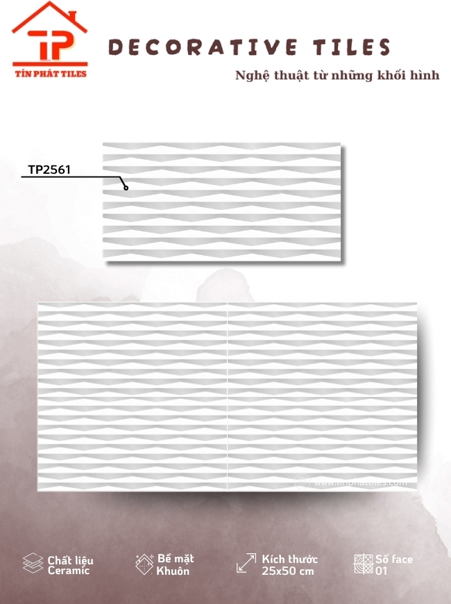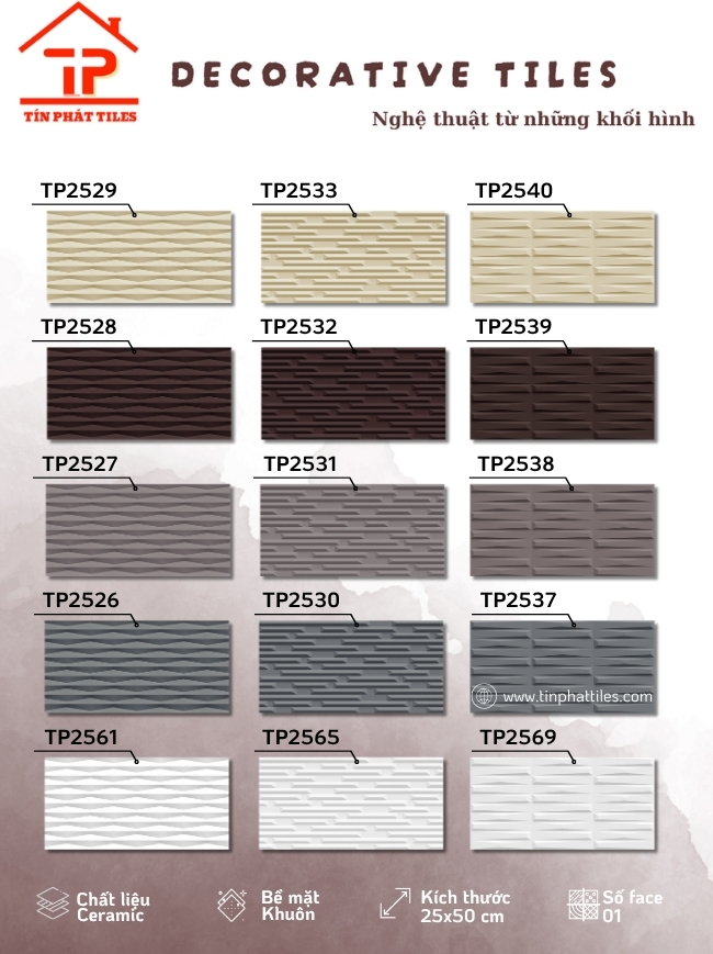 Bộ sưu tập sở hữu kích thước 25x50cm cân đối, dễ thi công, được sản xuất từ chất liệu ceramic bền chắc, phù hợp cho nhiều khu vực ốp tường. Điểm nhấn nằm ở bề mặt khuôn/matt tinh tế, tạo chiều sâu nhẹ nhàng, mang lại cảm giác sang trọng mà vẫn gần gũi, dễ ứng dụng cho phòng khách, phòng tắm hay không gian bếp.