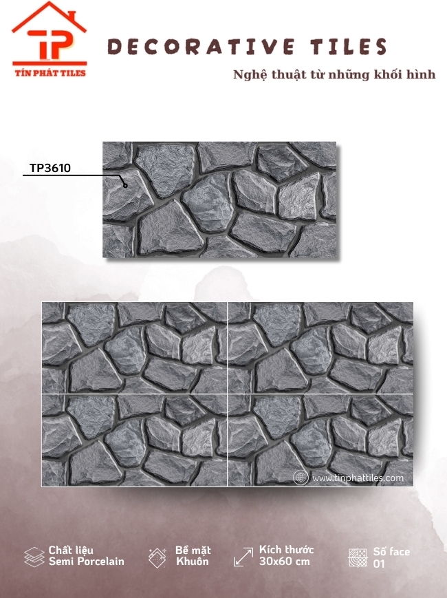 Lấy cảm hứng từ những viên đá tự nhiên đầy ngẫu hứng, bộ sưu tập gạch 30x60 giả đá mang đến cảm giác chân thực như chạm vào từng lớp trầm tích của thời gian. Kích thước 30x60cm cân đối, dễ ứng dụng, giúp không gian vừa gọn gàng vừa toát lên nét sang trọng rất “đắt giá”. Bề mặt matt/khuôn nhẹ nhàng tái hiện vân đá một cách tinh tế, tạo chiều sâu thị giác mà vẫn giữ được sự dịu mắt, không phô trương nhưng đủ sức gây ấn tượng.