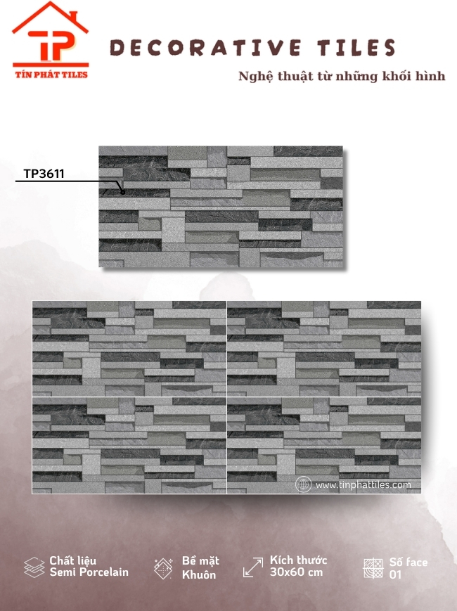 Lấy cảm hứng từ những viên đá tự nhiên đầy ngẫu hứng, bộ sưu tập gạch 30x60 giả đá mang đến cảm giác chân thực như chạm vào từng lớp trầm tích của thời gian. Kích thước 30x60cm cân đối, dễ ứng dụng, giúp không gian vừa gọn gàng vừa toát lên nét sang trọng rất “đắt giá”. Bề mặt matt/khuôn nhẹ nhàng tái hiện vân đá một cách tinh tế, tạo chiều sâu thị giác mà vẫn giữ được sự dịu mắt, không phô trương nhưng đủ sức gây ấn tượng.