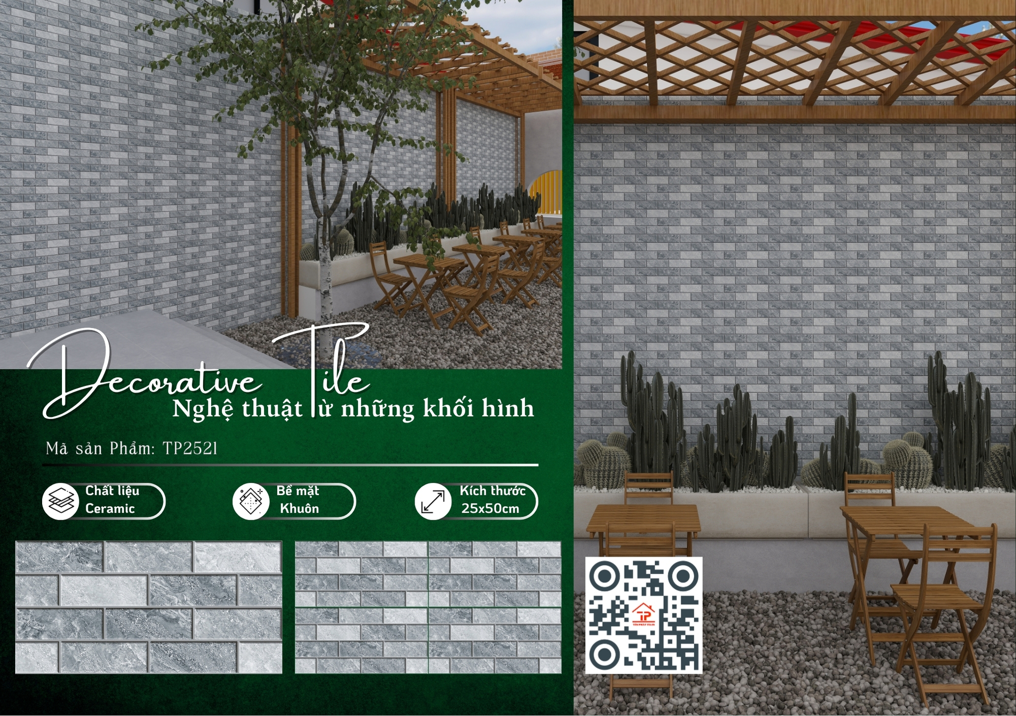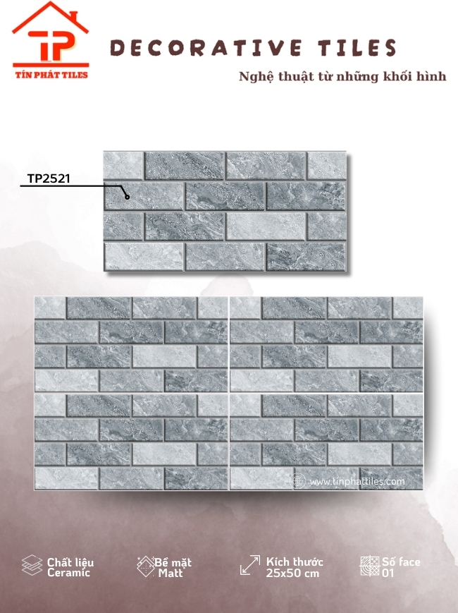 Bộ sưu tập sở hữu kích thước 25x50cm cân đối, dễ thi công, được sản xuất từ chất liệu ceramic bền chắc, phù hợp cho nhiều khu vực ốp tường. Điểm nhấn nằm ở bề mặt khuôn/matt tinh tế, tạo chiều sâu nhẹ nhàng, mang lại cảm giác sang trọng mà vẫn gần gũi, dễ ứng dụng cho phòng khách, phòng tắm hay không gian bếp.