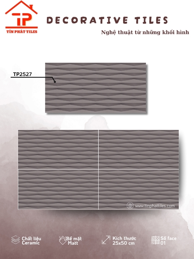 Bộ sưu tập sở hữu kích thước 25x50cm cân đối, dễ thi công, được sản xuất từ chất liệu ceramic bền chắc, phù hợp cho nhiều khu vực ốp tường. Điểm nhấn nằm ở bề mặt khuôn/matt tinh tế, tạo chiều sâu nhẹ nhàng, mang lại cảm giác sang trọng mà vẫn gần gũi, dễ ứng dụng cho phòng khách, phòng tắm hay không gian bếp.