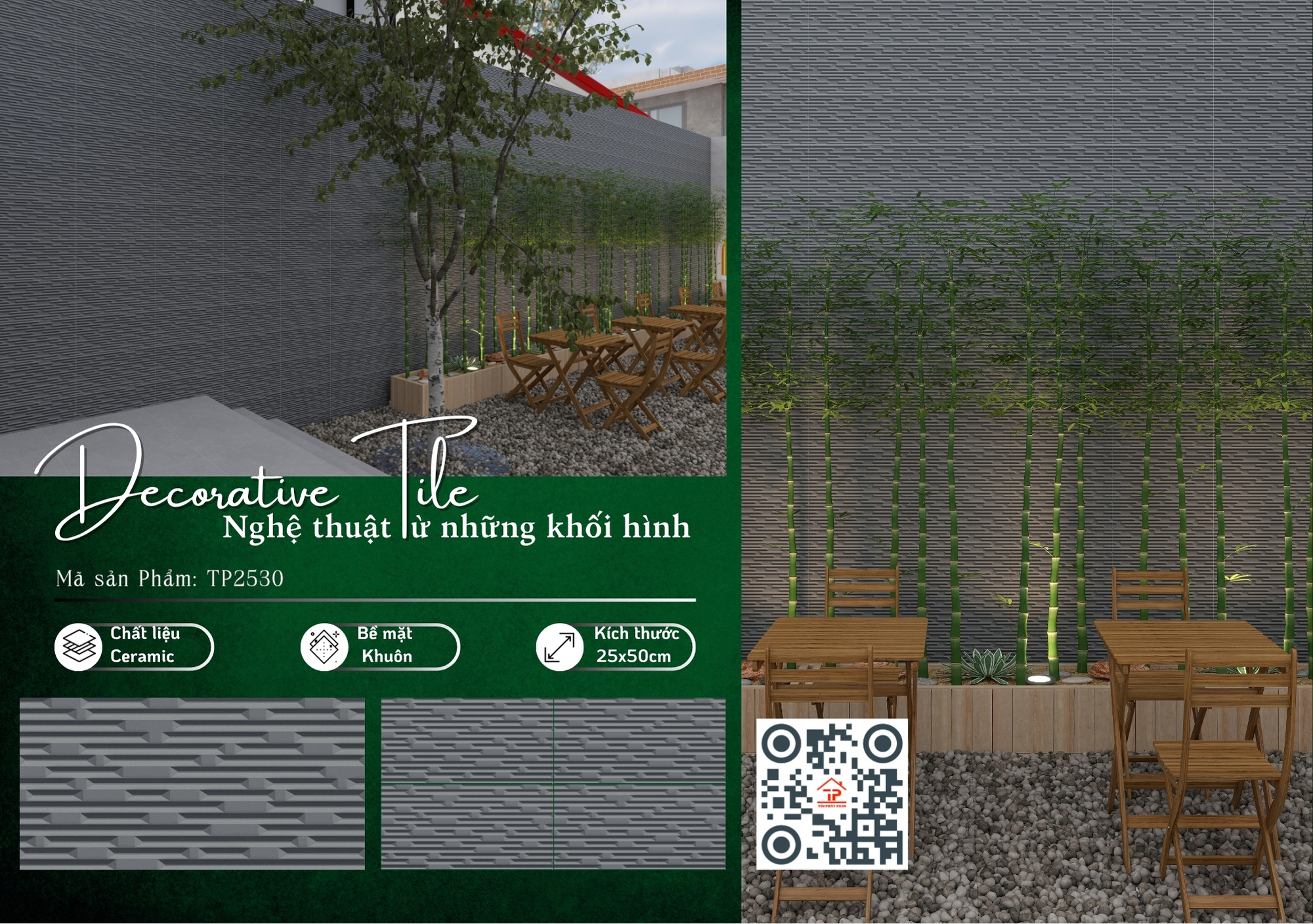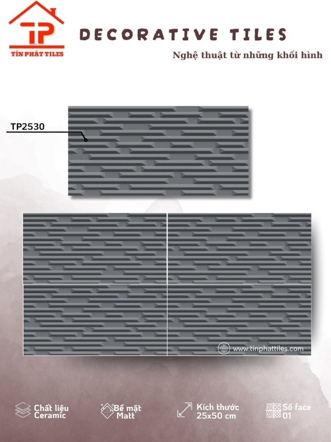 Bộ sưu tập sở hữu kích thước 25x50cm cân đối, dễ thi công, được sản xuất từ chất liệu ceramic bền chắc, phù hợp cho nhiều khu vực ốp tường. Điểm nhấn nằm ở bề mặt khuôn/matt tinh tế, tạo chiều sâu nhẹ nhàng, mang lại cảm giác sang trọng mà vẫn gần gũi, dễ ứng dụng cho phòng khách, phòng tắm hay không gian bếp.