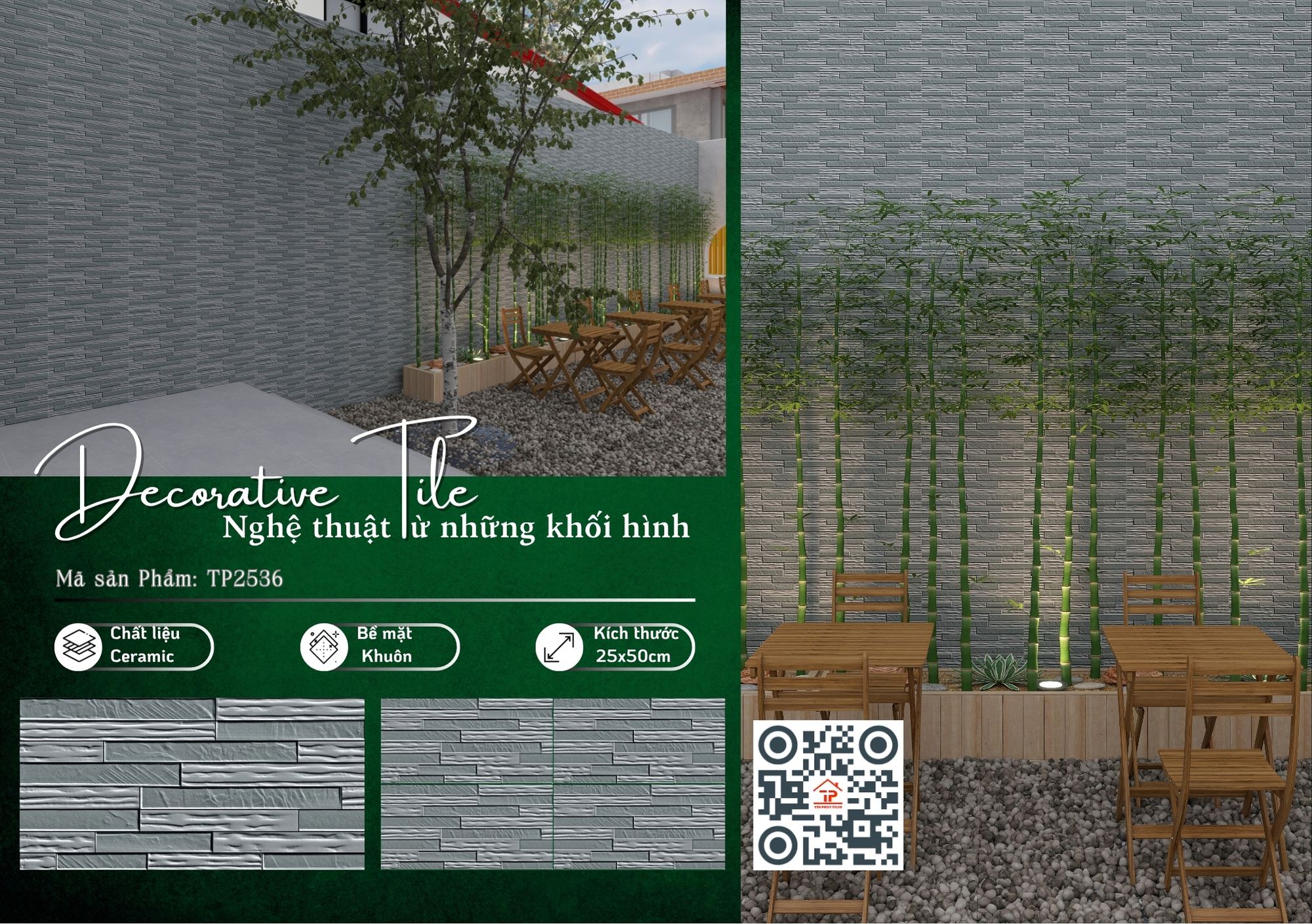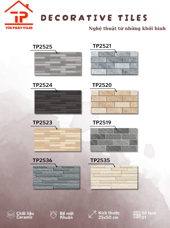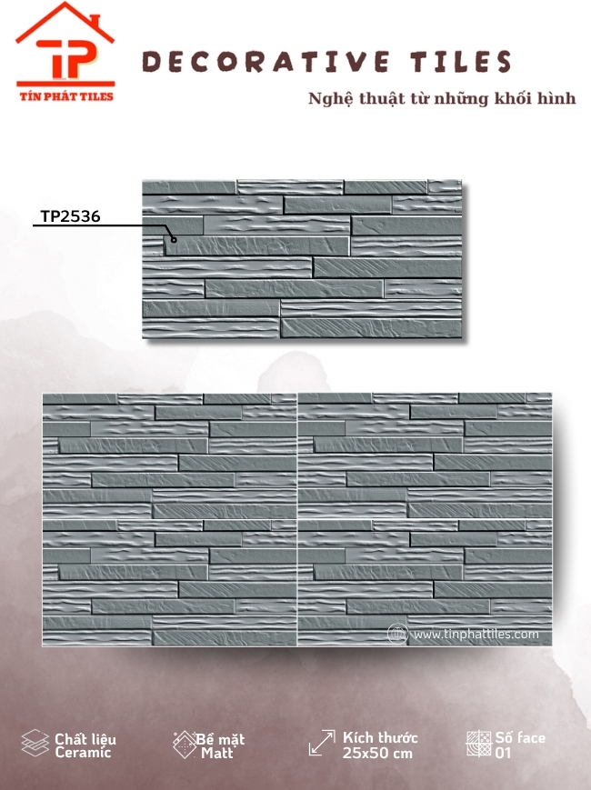 Bộ sưu tập sở hữu kích thước 25x50cm cân đối, dễ thi công, được sản xuất từ chất liệu ceramic bền chắc, phù hợp cho nhiều khu vực ốp tường. Điểm nhấn nằm ở bề mặt khuôn/matt tinh tế, tạo chiều sâu nhẹ nhàng, mang lại cảm giác sang trọng mà vẫn gần gũi, dễ ứng dụng cho phòng khách, phòng tắm hay không gian bếp.