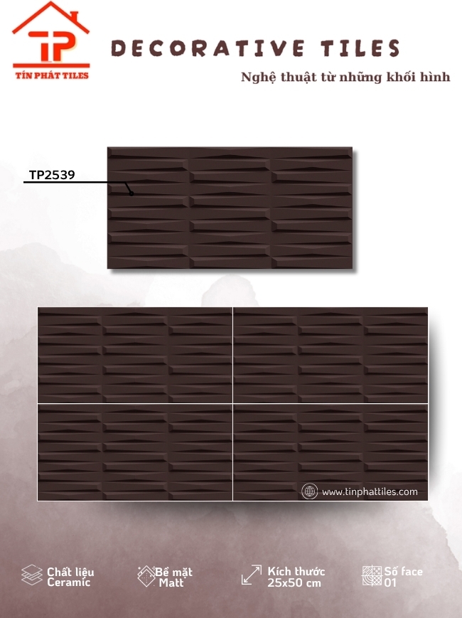 Bộ sưu tập sở hữu kích thước 25x50cm cân đối, dễ thi công, được sản xuất từ chất liệu ceramic bền chắc, phù hợp cho nhiều khu vực ốp tường. Điểm nhấn nằm ở bề mặt khuôn/matt tinh tế, tạo chiều sâu nhẹ nhàng, mang lại cảm giác sang trọng mà vẫn gần gũi, dễ ứng dụng cho phòng khách, phòng tắm hay không gian bếp.